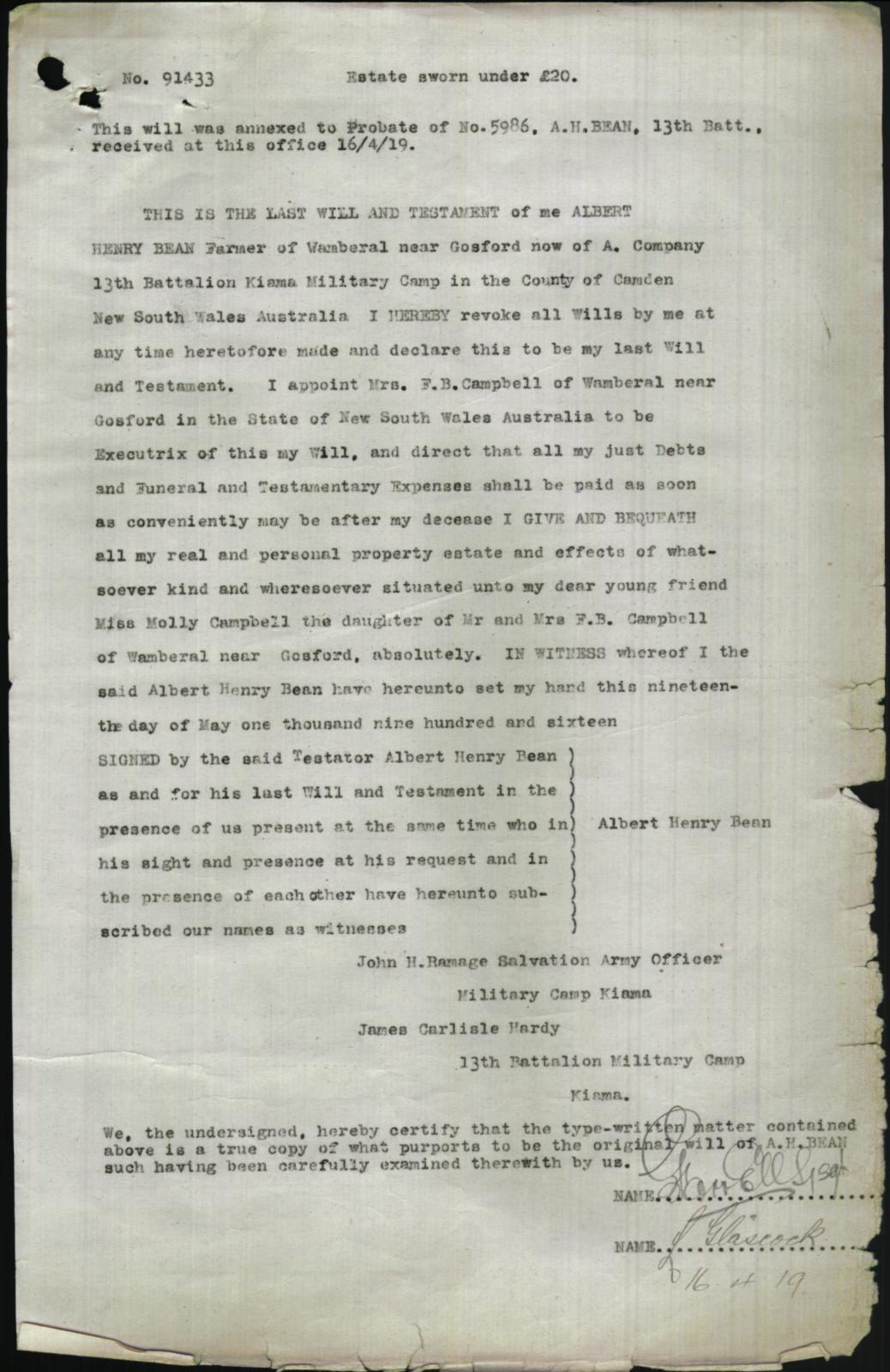 Published May 15, 2016 at 1038 × 1600 in Private Albert [Bert] Bean – Bullecourt Digger Last will and testament of Albert Bean Share this: Email a link to a friend (Opens in new window) Email Print (Opens in new window) Print Share on X (Opens in new window) X Share on Facebook (Opens in new window) Facebook Like Loading... ‹ Return to post Leave a comment Cancel reply